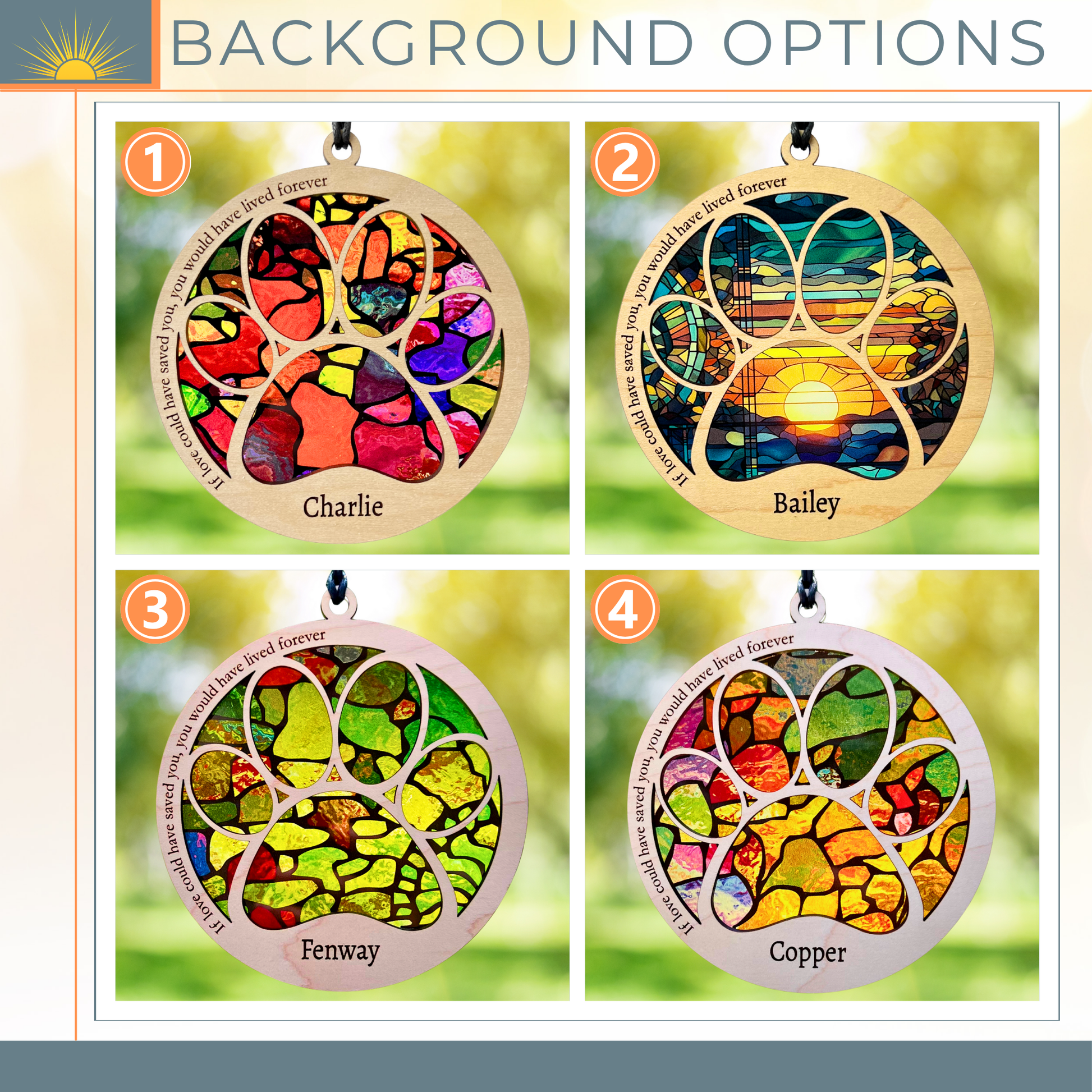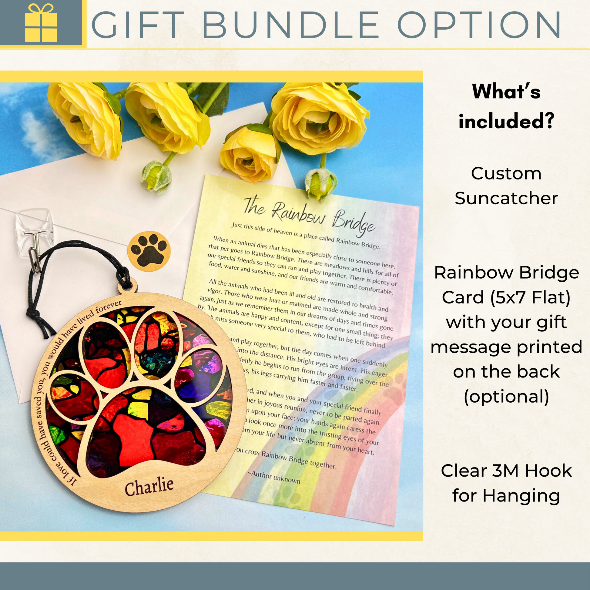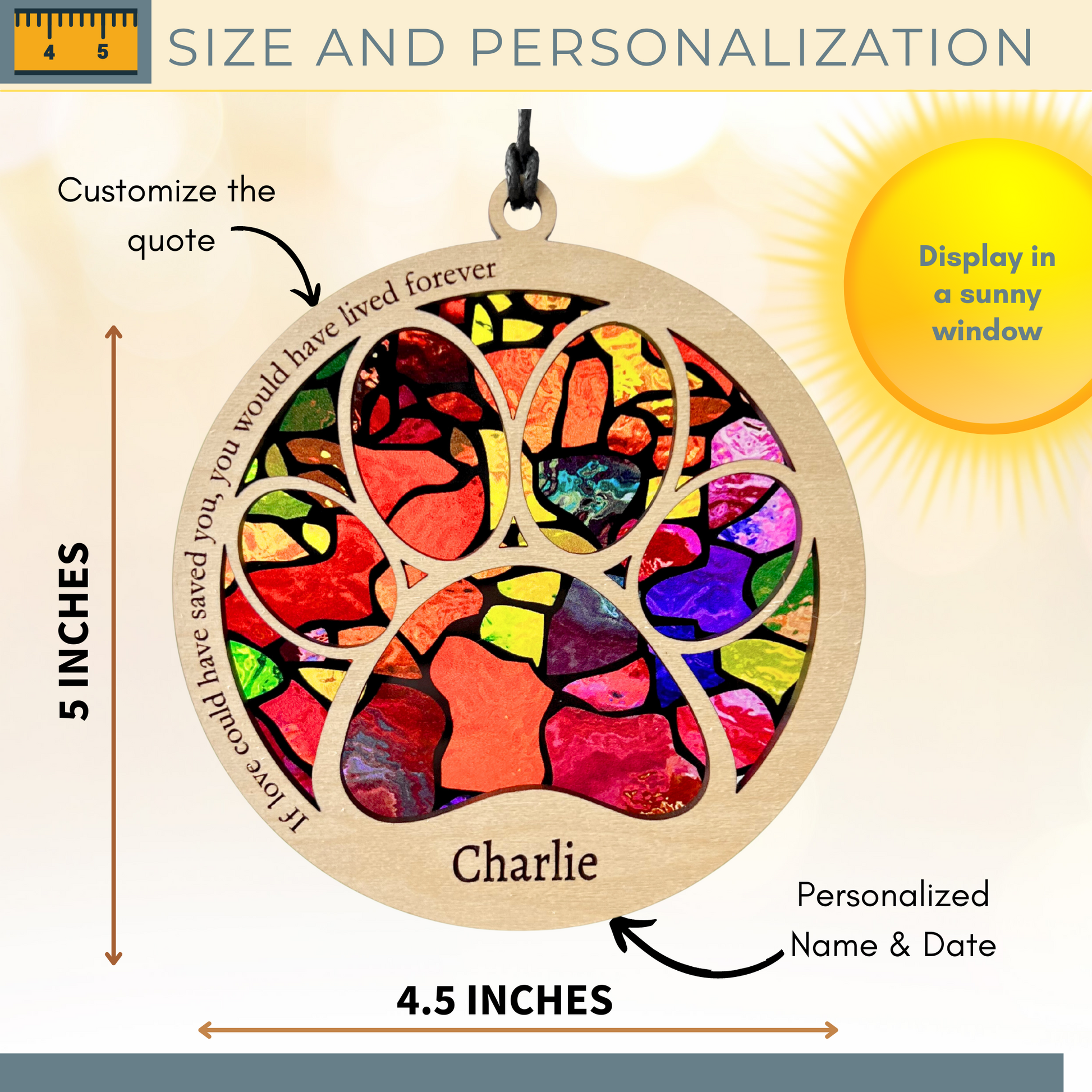 Personalize your suncatcher with your pet’s name and dates to create a one-of-a-kind memorial. Measuring approximately 5" x 4.5", it’s perfectly sized to hang in a sunny window or special place in your home.